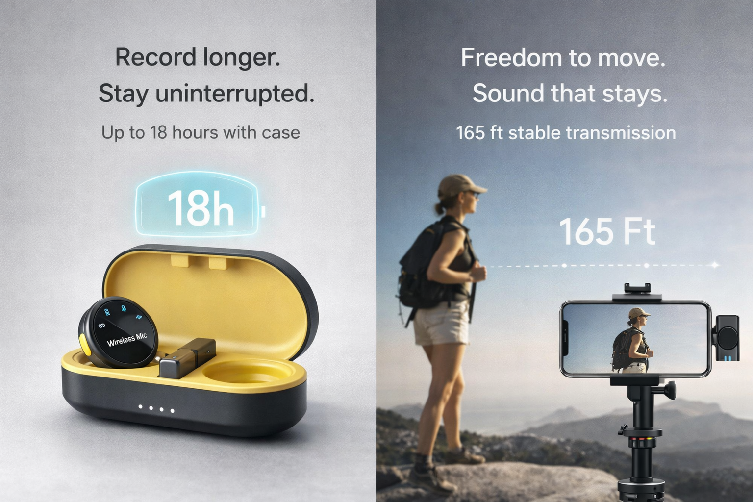 Dual Wireless Microphones: Perfect for interviews & two-person recording